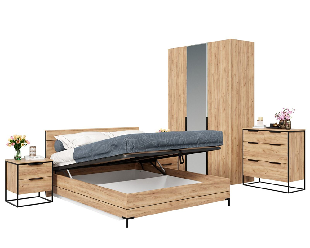 Հավաքածուն ներառում է՝ մահճակալ-պահոցով, ՄԴՖ և ԼԴՍՊ, օրթոպեդ հիմք, չափս-1670*2110*910, զգեստապահարան 3դուռ-ՄԴՖ և ԼԴՍՊ, 2դուռ փակ,1դուռը հայելի, 2դուռը՝ կախիչ, 1դուռը՝ դարակաշար, չափսը՝ 1644*590*2300, կոմոդ ՝ 892*457*900, տումբա՝ 502*457*550
